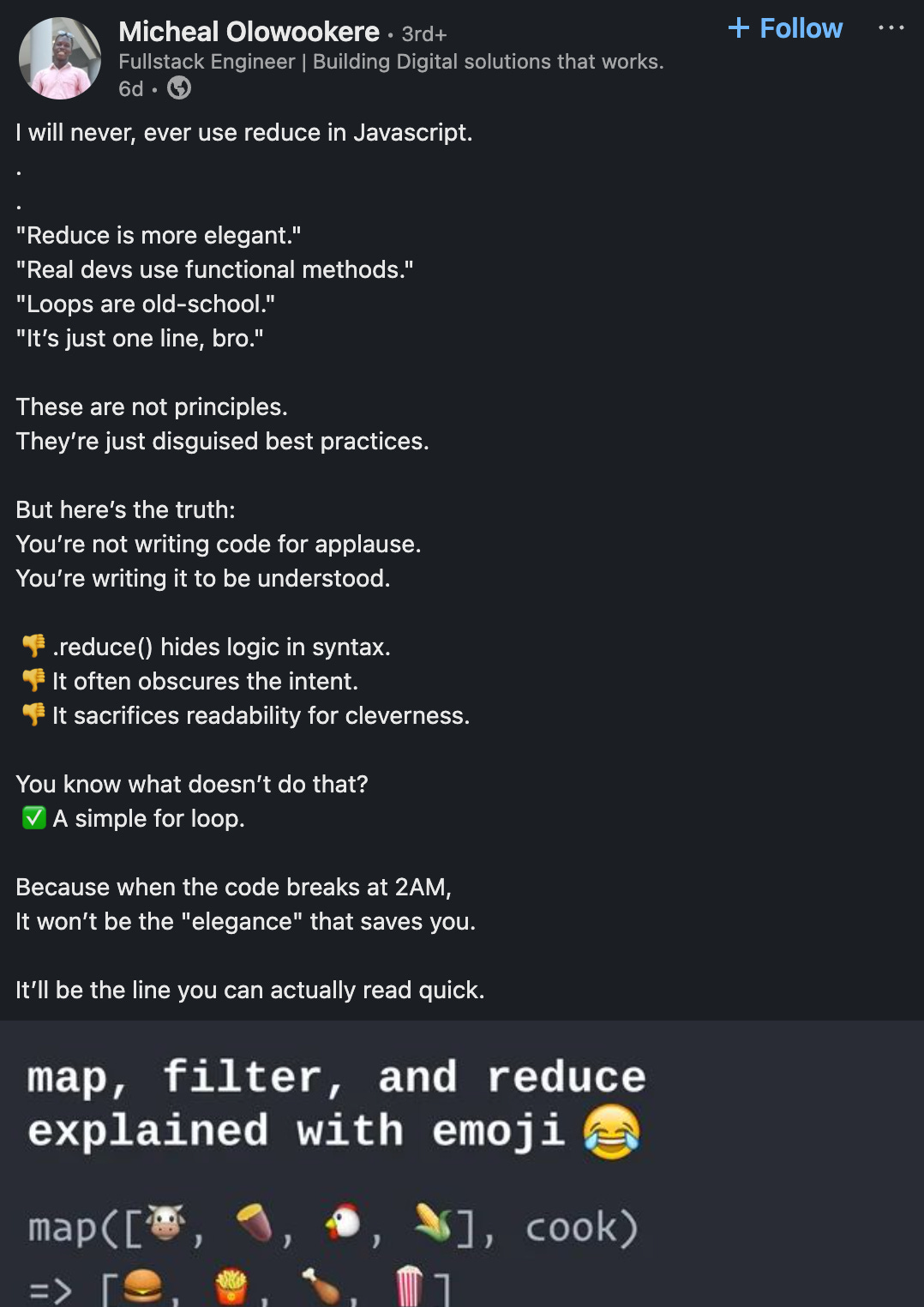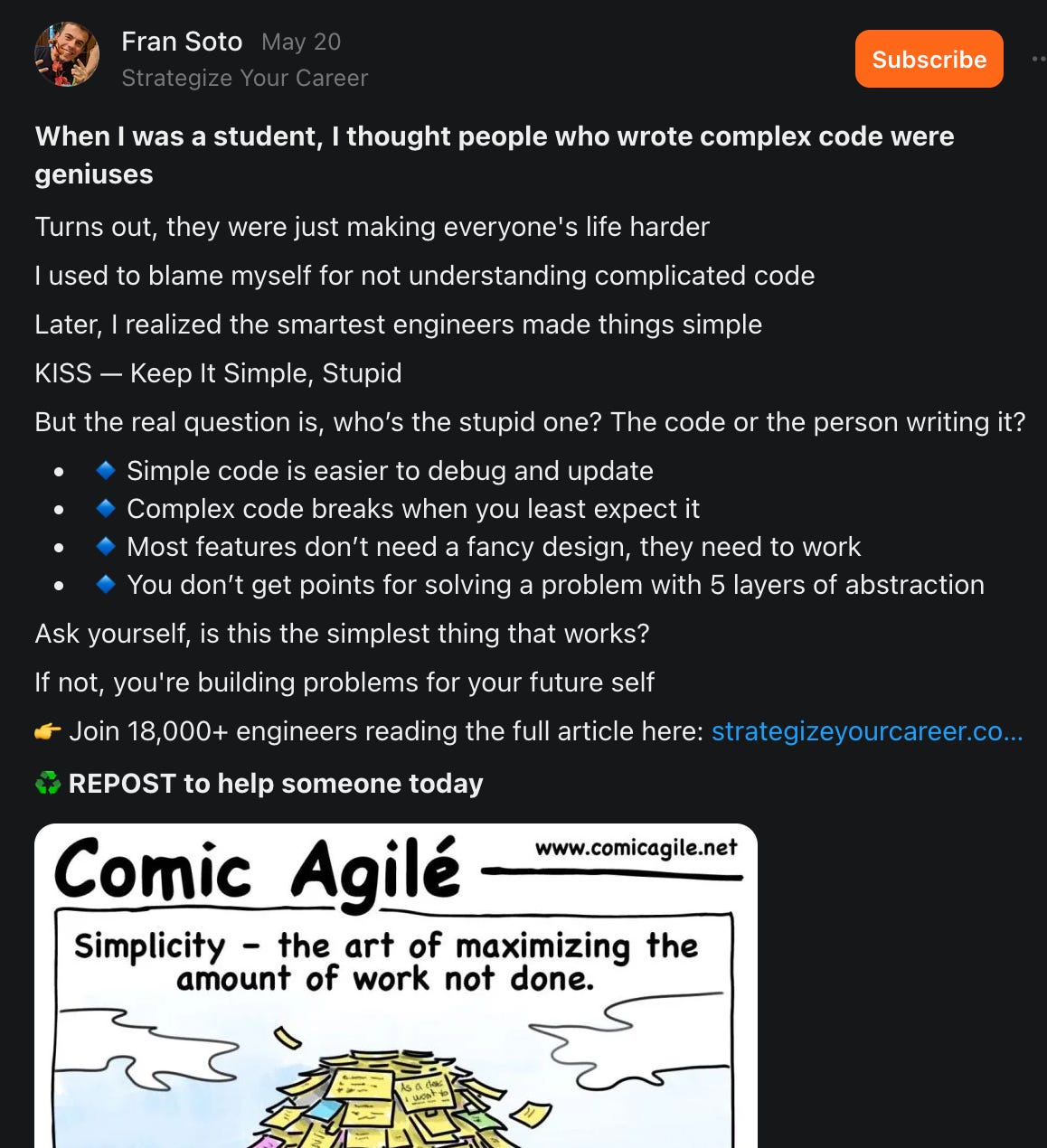 Provocative content like this is why I have ICs on my teams who feel seemingly entitled to not have to learn more sophisticated techniques, or at least understand the difference between complex and complicated code. The truth is that you can’t achieve simplicity without understanding complexity and how to use it strategically. He may be an engineer at Amazon but the lack of technical content on his blog speaks for itself.