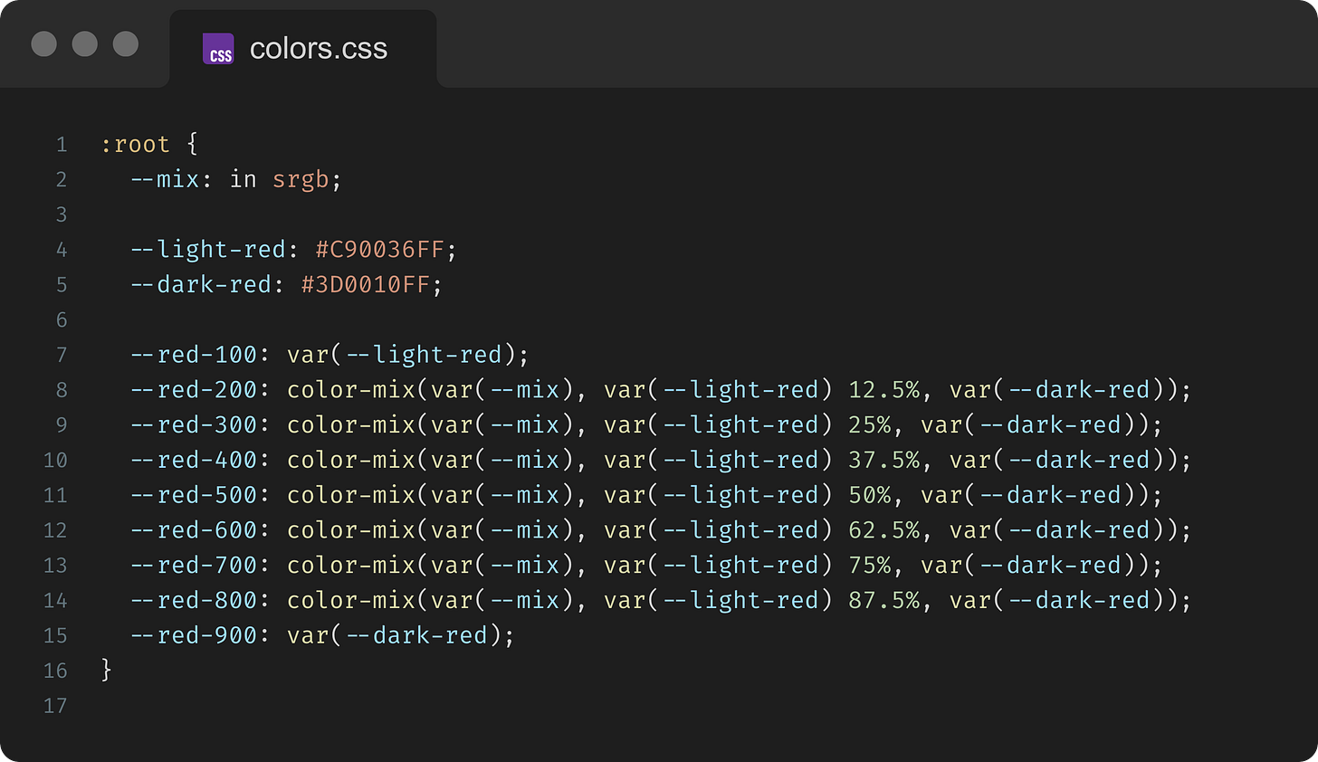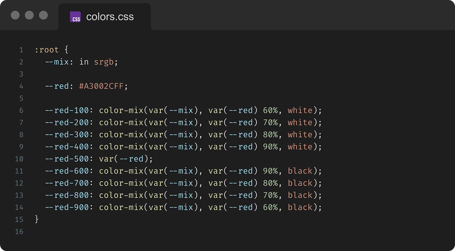Thankfully we don’t have to do all this by hand anymore, we can do it in CSS directly with color-mix():