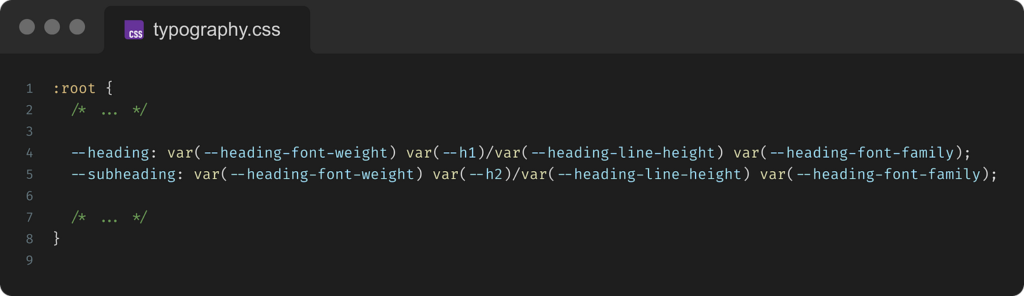 These tokens can then compose more complex qualia for the headings as CSS font shorthands: